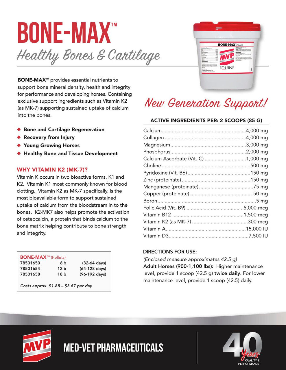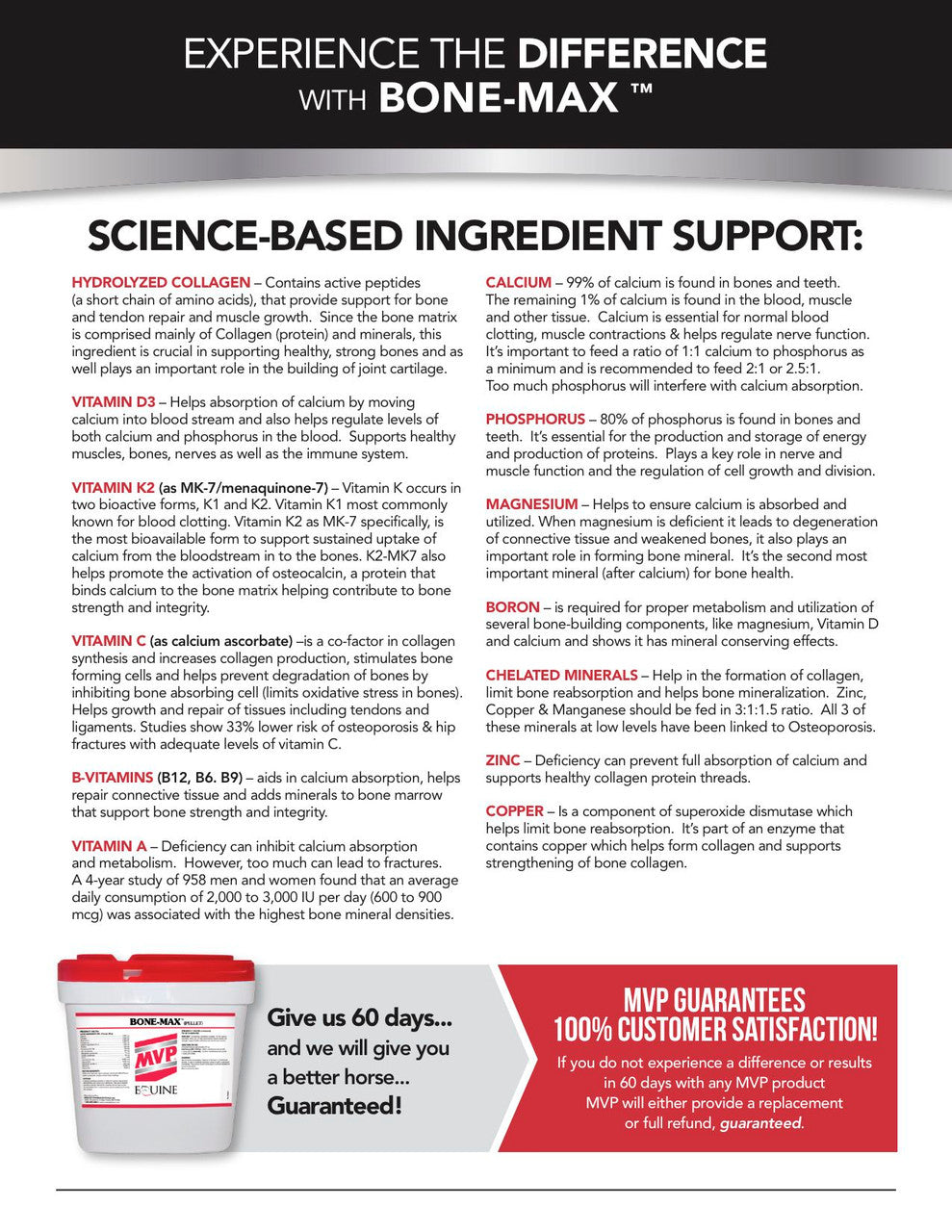 Bone-Max™ provides essential nutrients to support bone mineral density, health and integrity for performance and developing horses. Containing exclusive support ingredients such as Vitamin K2 (as MK-7) supporting sustained uptake of calcium into the bones providing greater bioavailability.